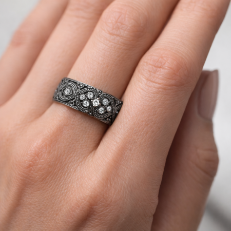 Efekt głębokiej, eleganckiej czerni powstaje dzięki pokryciu biżuterii czarnym rodem – szlachetnym metalem z tej samej rodziny co platyna.