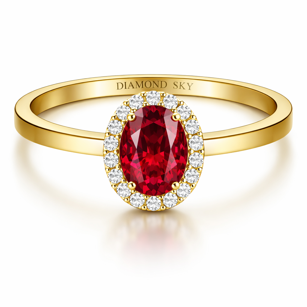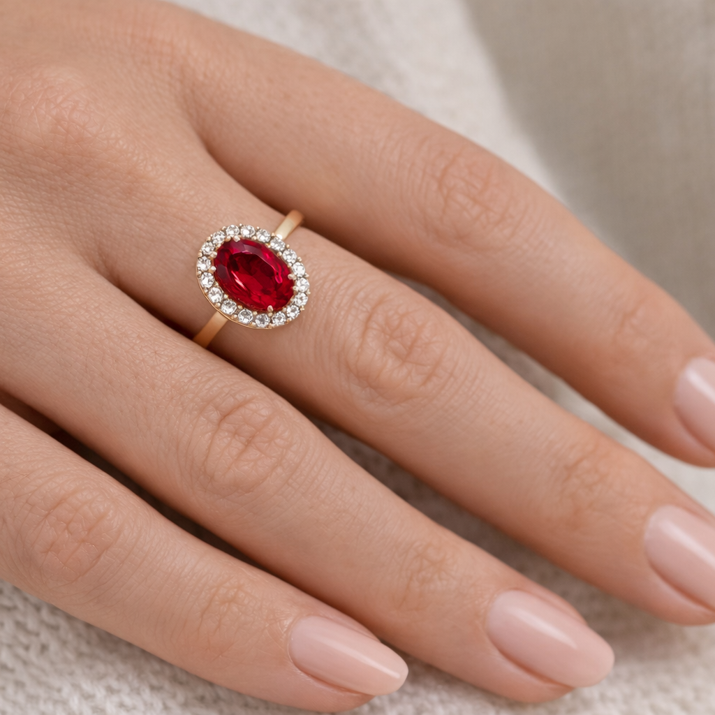 Głęboki, nasycony rubin otoczony subtelną aureolą brylantów tworzy kompozycję pełną światła i emocji.