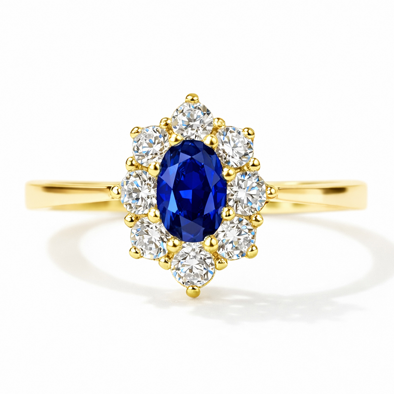 Diamentowa Elipsa – Pierścionek zaręczynowy z żółtego złota z szafirem i diamentami