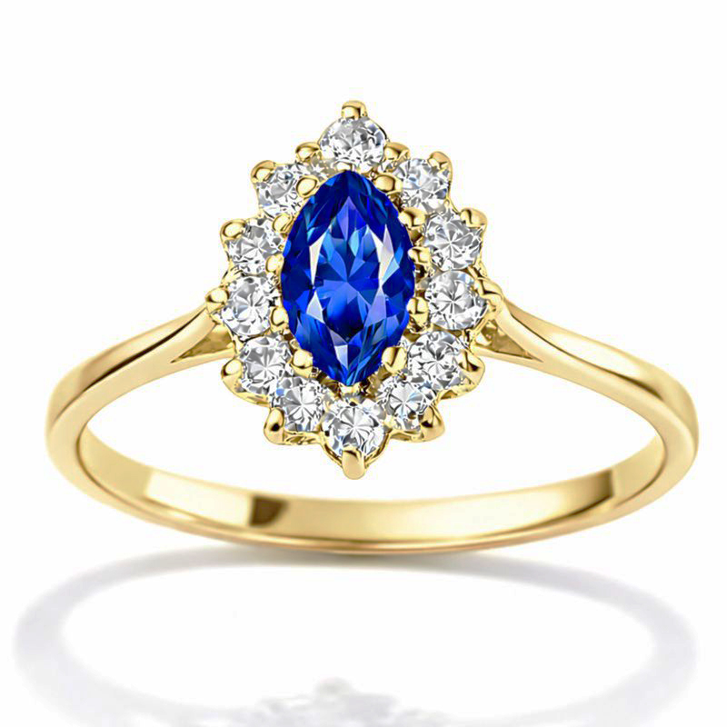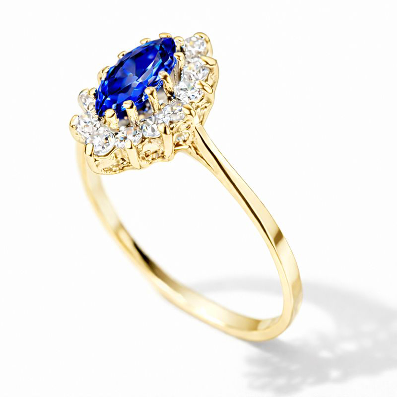 Diamentowa Linia – Pierścionek zaręczynowy z żółtego złota z szafirem o szlifie markiza i diamentami