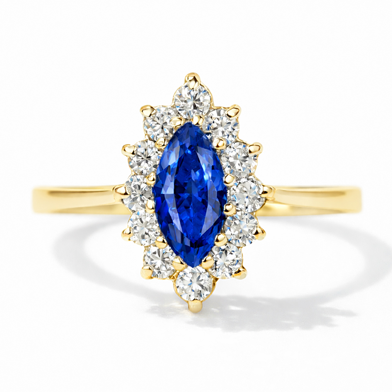 Ten wyjątkowy pierścionek zachwyca centralnym szafirem w szlifie markiza,