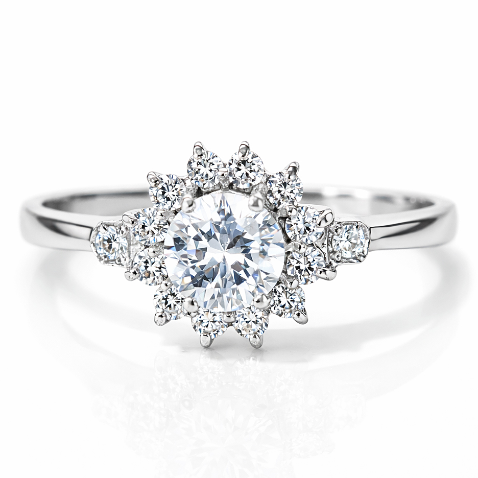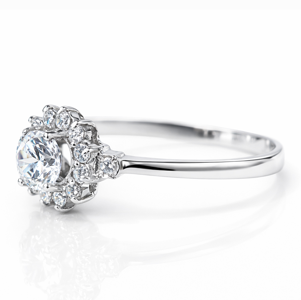 Otaczające go diamenty boczne tworzą harmonijną oprawę, potęgując efekt świetlistości i luksusu.