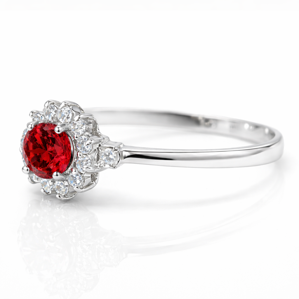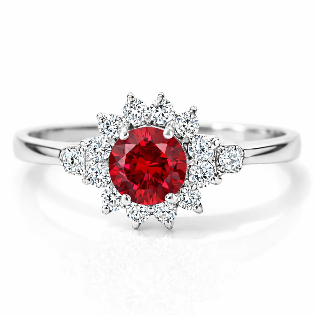 Kryształowa forma – Pierścionek zaręczynowy z białego złota z rubinem i diamentami