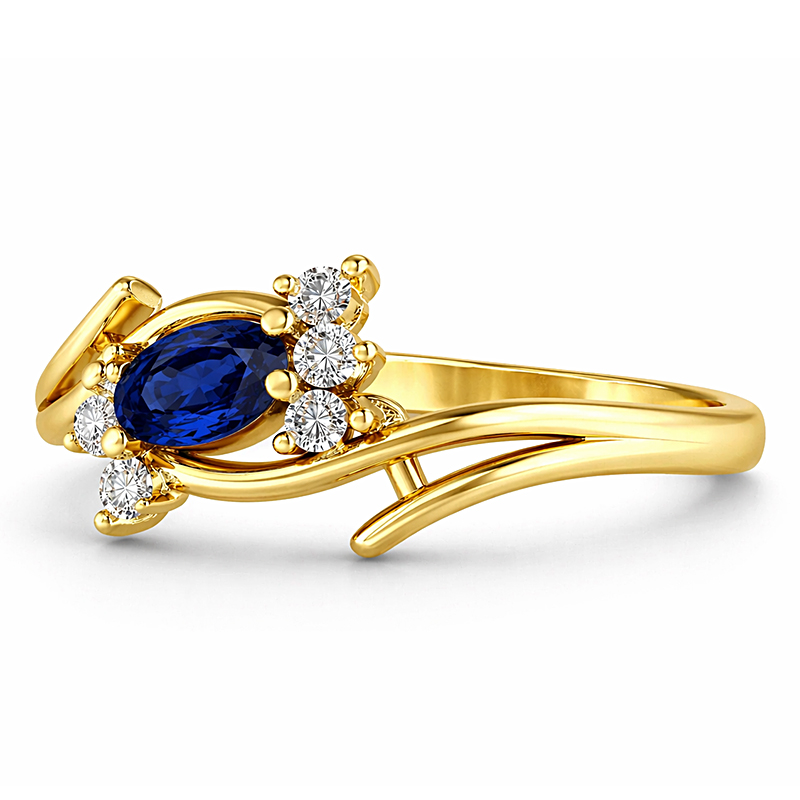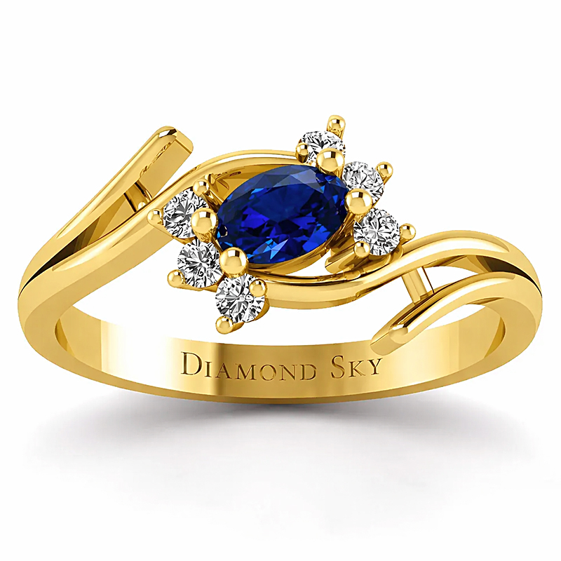 Wykonany z żółtego złota próby 585 oraz ozdobiony owalnym szafirem oraz brylantami pełnymi blasku.