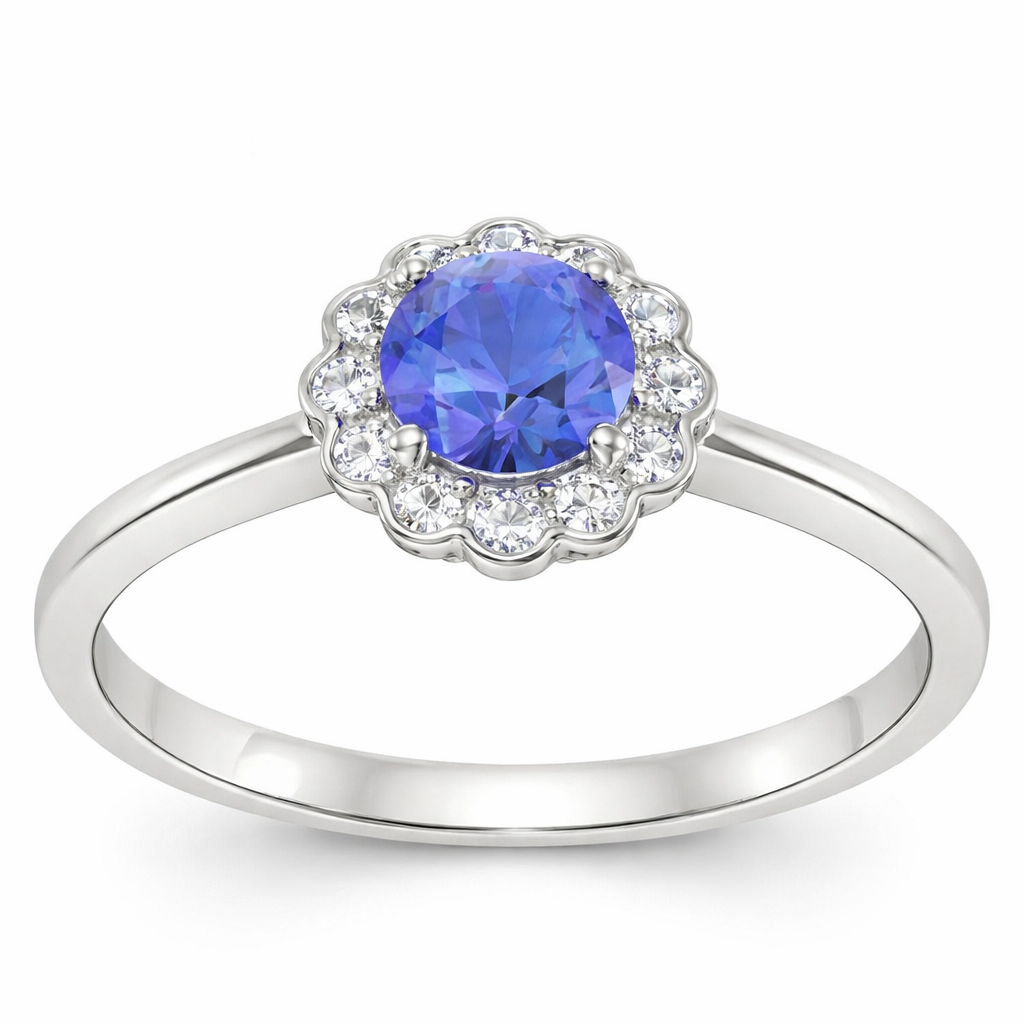 Centralny tanzanitem o delikatnej, fioletowej barwie otaczają lśniące, mniejsze diamenty niczym krople rosy na porannej łące.