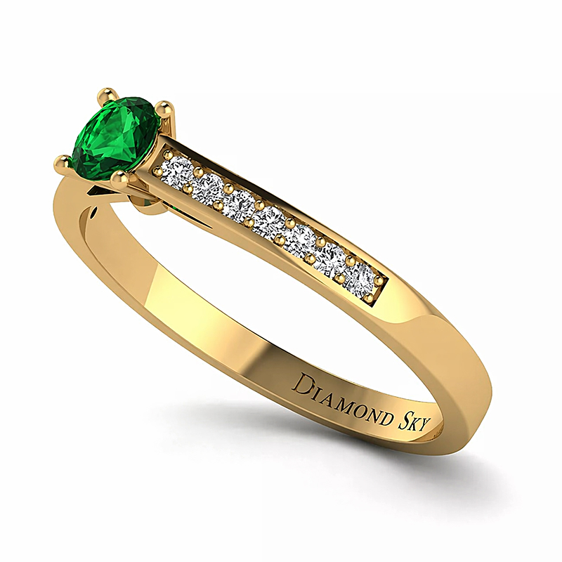 Lśniąca elegancja – pierścionek zaręczynowy, żółte złoto ze szmaragdem i diamentami