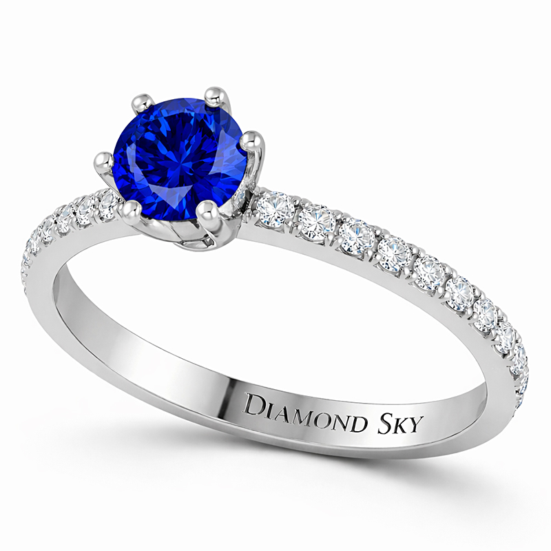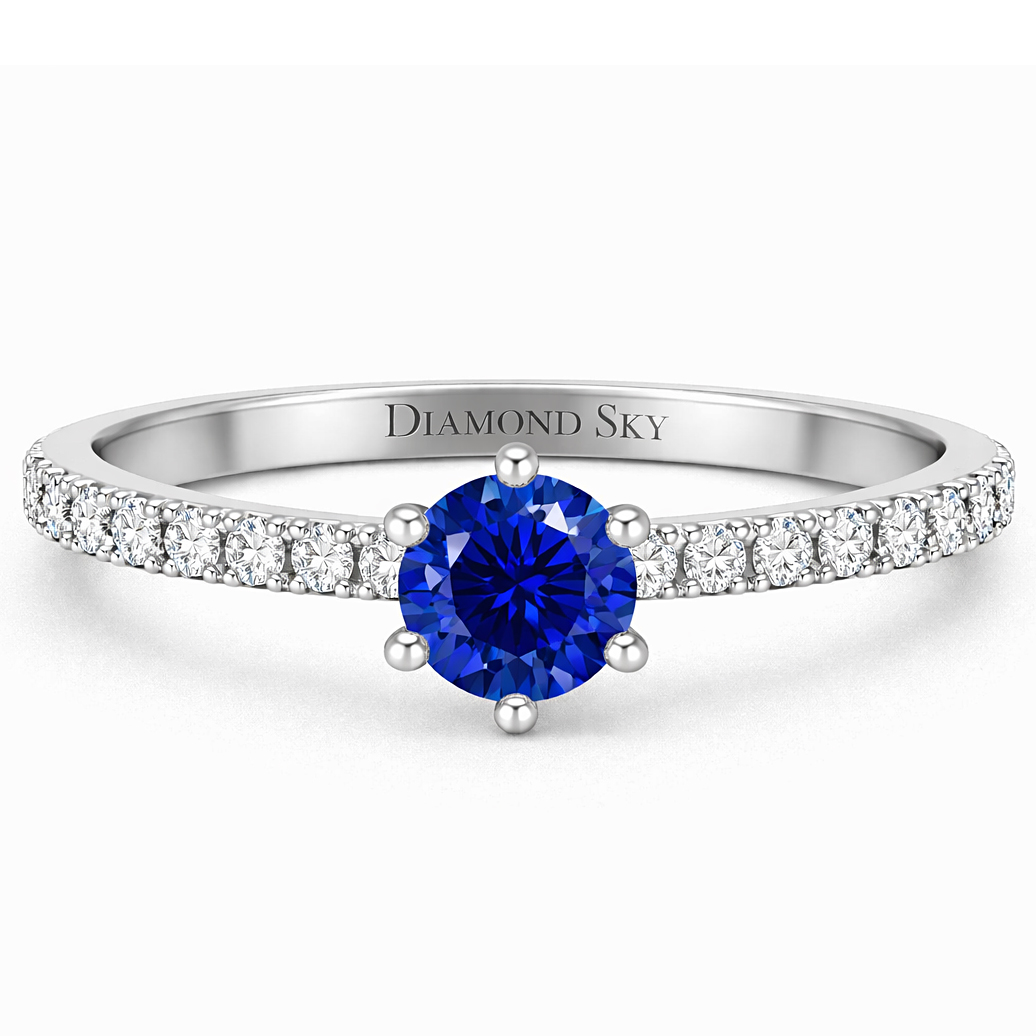 Centralny szafir w klasycznej, sześciokrapowej oprawie unosi się lekko ponad szyną, pozwalając światłu swobodnie przenikać przez jego strukturę i wydobywać pełnię blasku.