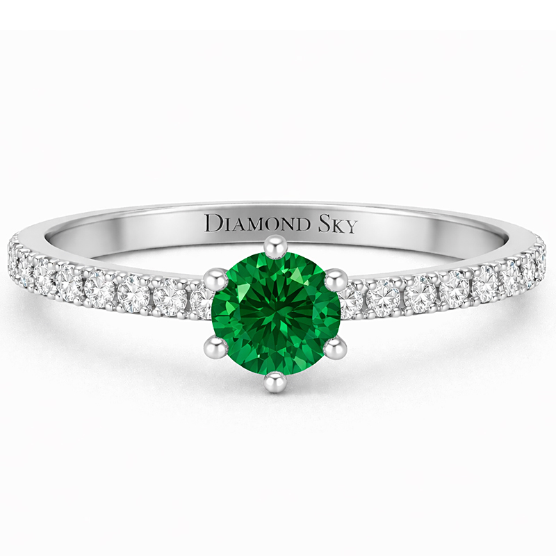Centralny szmaragd w klasycznej, sześciokrapowej oprawie unosi się lekko ponad szyną, pozwalając światłu swobodnie przenikać przez jego strukturę i wydobywać pełnię blasku.