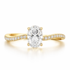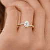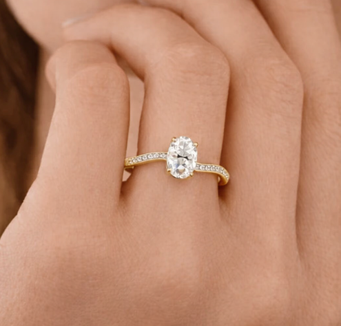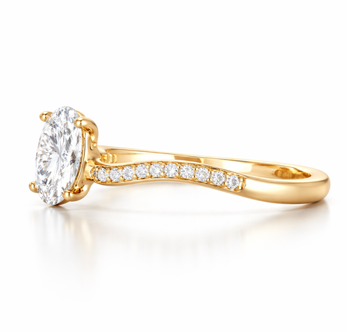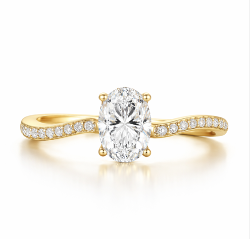 W centrum kompozycji znajduje się owalny diament — szlif, który optycznie wydłuża palce i podkreśla elegancję dłoni.