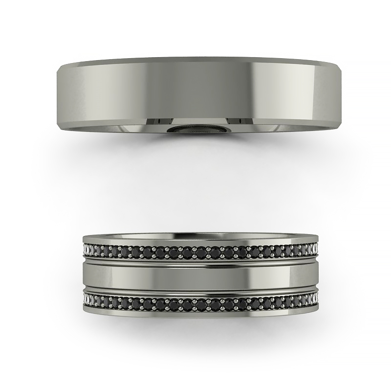 Damska obrączka o szerokości 6.0 mm ozdobiona czarnymi brylantami oprawionymi wzdłuż dwóch krawędzi, środek wykończony połyskiem i dwoma delikatnymi rowkami.