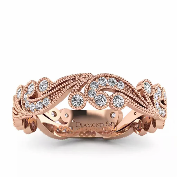 Orientalny szyk – Ażurowa obrączka ślubna z różowego złota z diamentami