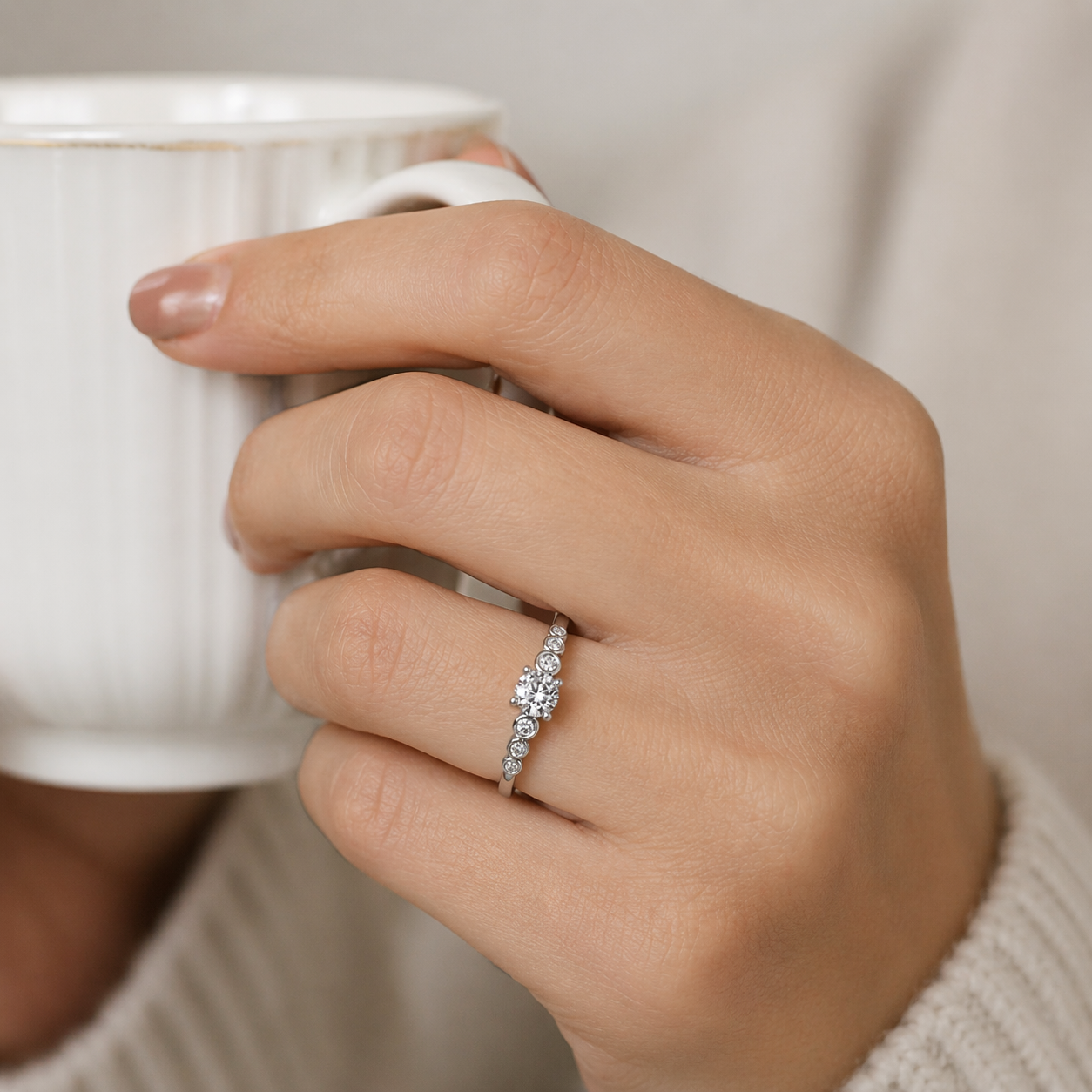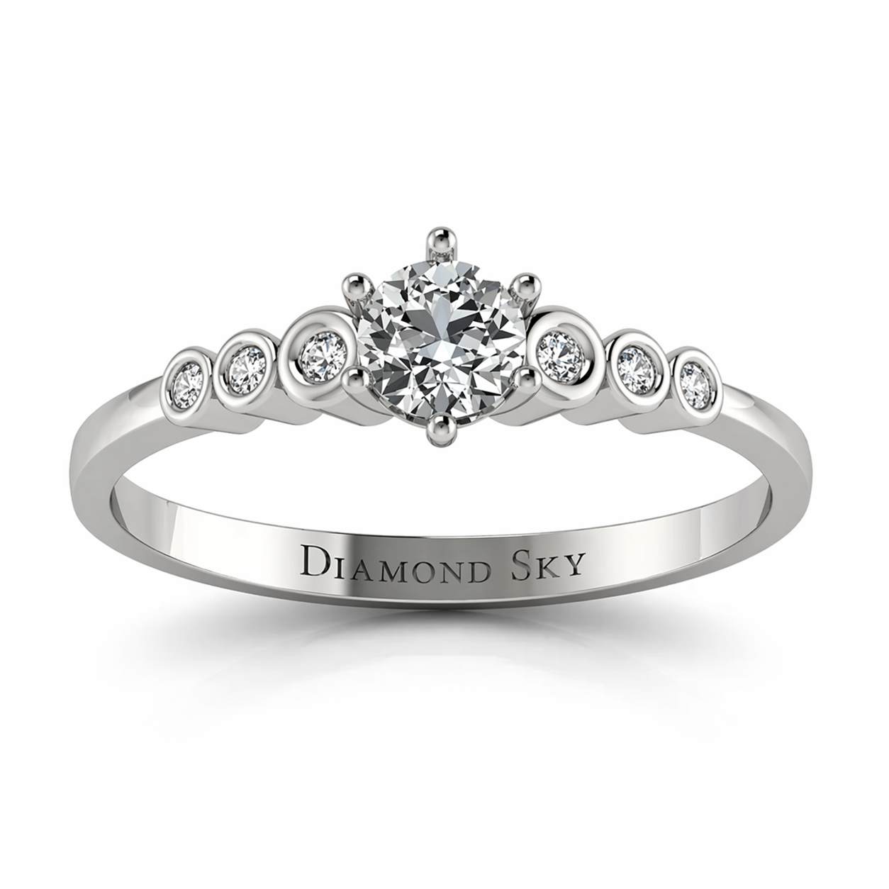 Szyna została ozdobiona sześcioma diamentami laboratoryjnymi, które nadają całości subtelnego blasku i wyrafinowanej elegancji. Ich precyzyjny szlif oraz harmonijne rozmieszczenie podkreślają centralny kamień, tworząc spójną i luksusową kompozycję. To rozwiązanie sprawia, że pierścionek przyciąga uwagę i wyróżnia się na tle klasycznych modeli.