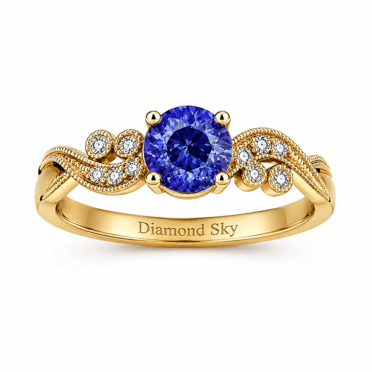 Dotyk Piękna – Pierścionek zaręczynowy z żółtego złota z tanzanitem i diamentami