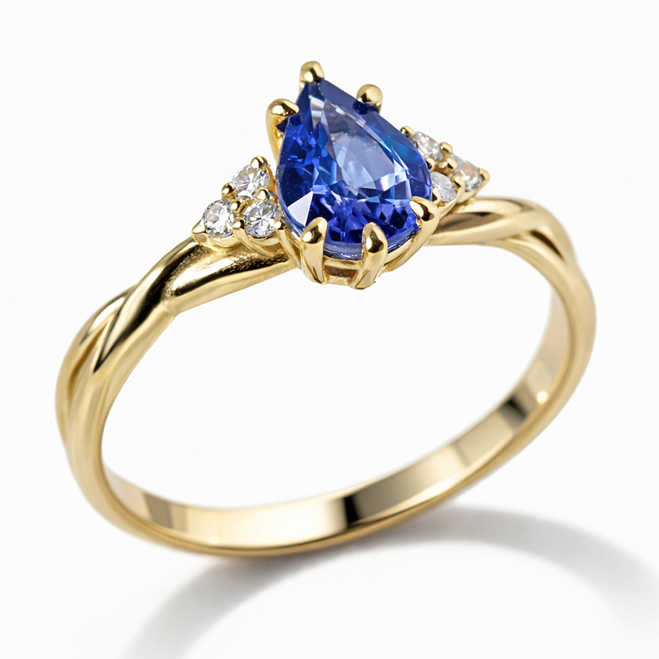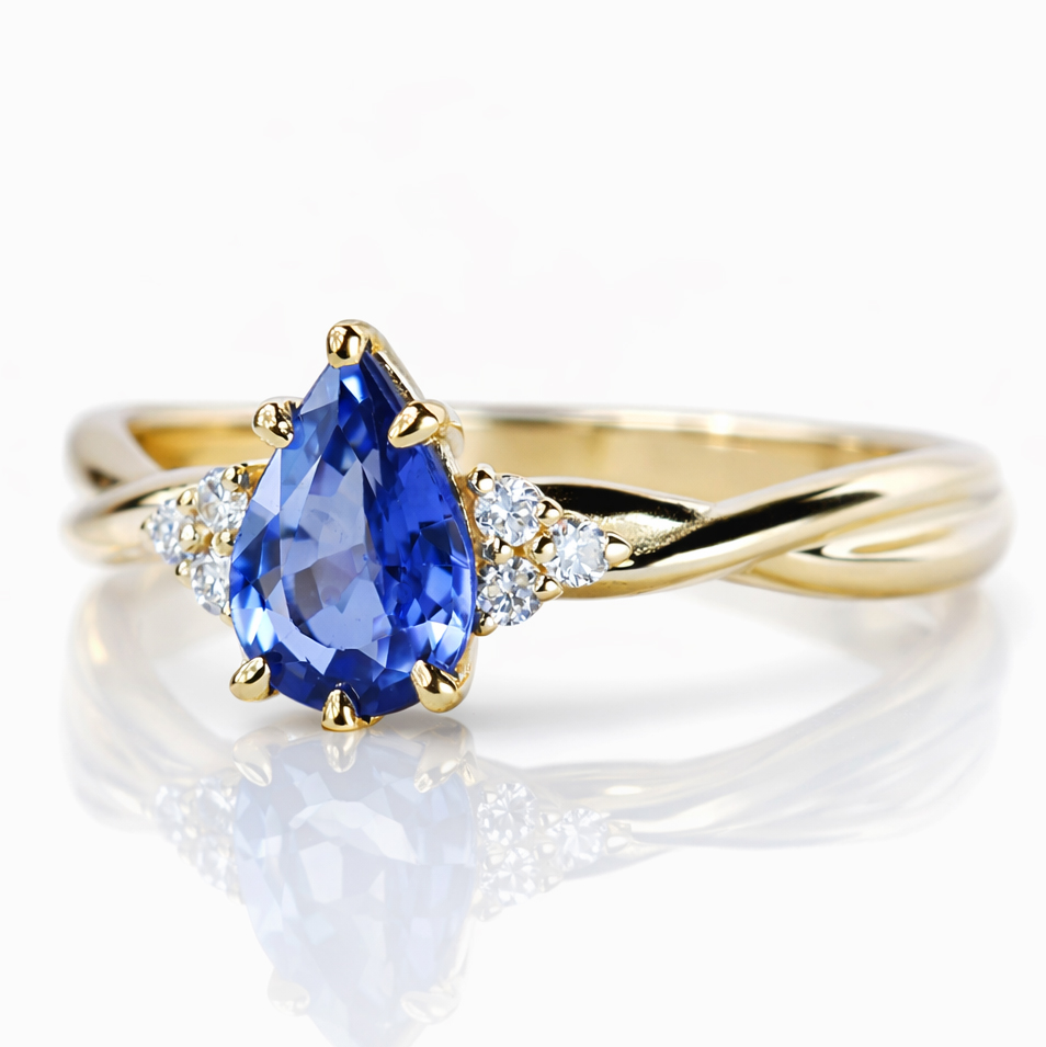 Subtelna harmonia – Pierścionek zaręczynowy z żółtego złota z szafirem o szlifie łezka i diamentami