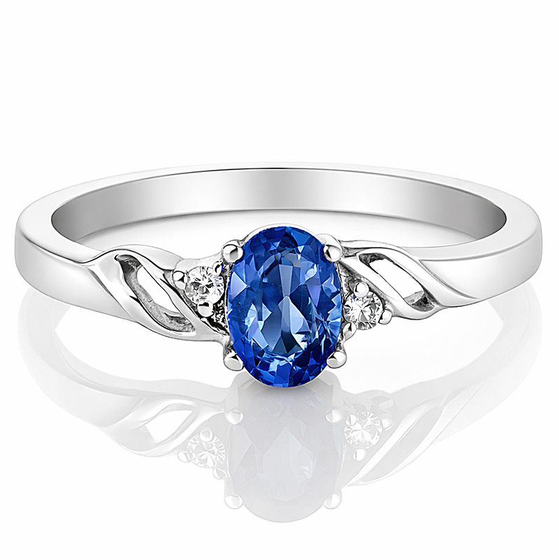 Po bokach kamienia osadzono lśniące diamenty, podkreślające kolor szafiru i nadające kompozycji wyjątkowej lekkości.